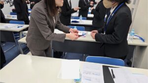 内定者の皆さんは、最初は緊張が感じられましたが、名刺交換の仕方などの実践練習を行っていくうちに、だんだんと緊張もほぐれていきました。